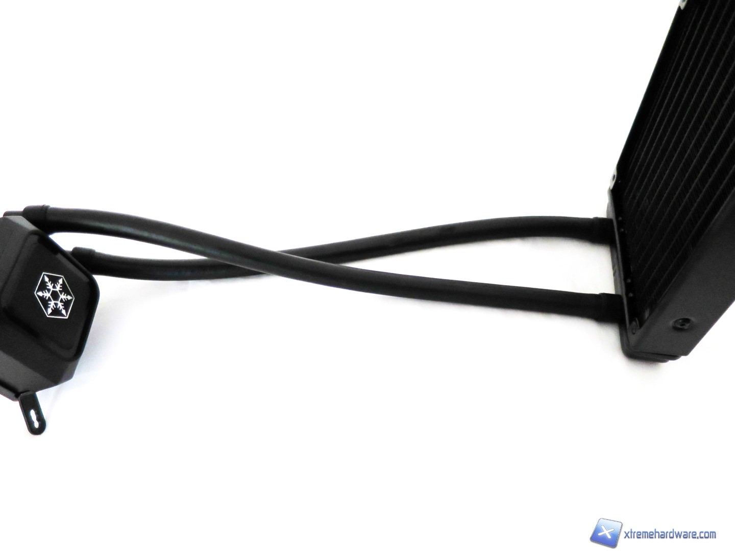 Proseguendo, passiamo ai tubi che sono in al solito in gomma con spessore esterno di 12mm e interno di 10mm. La pompa adottata dai due modelli della serie Tundra riesce facilmente a gestire radiatori da 120mm e da 240mm dunque SilverStone ha semplicemente cambiato dimensione del radiatore mantenendo inalterato il design degli altri componenti. I tubi sono sempre caratterizzati da una struttura intrecciata interna ed hanno una lunghezza di 310mm.