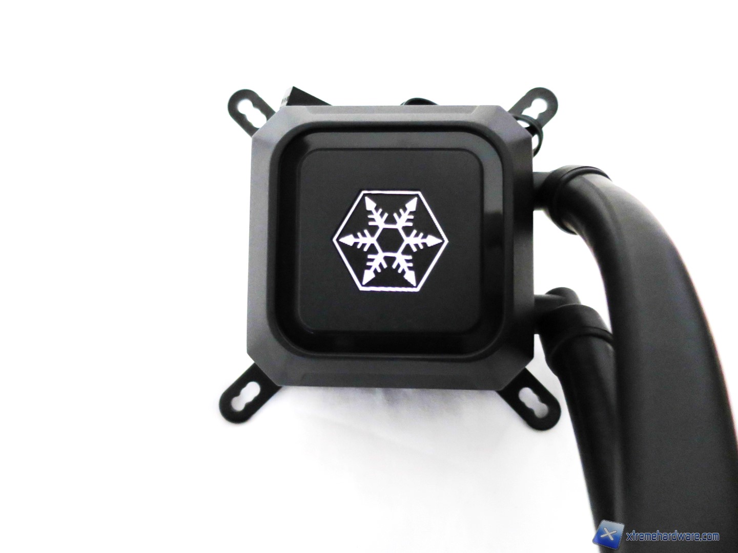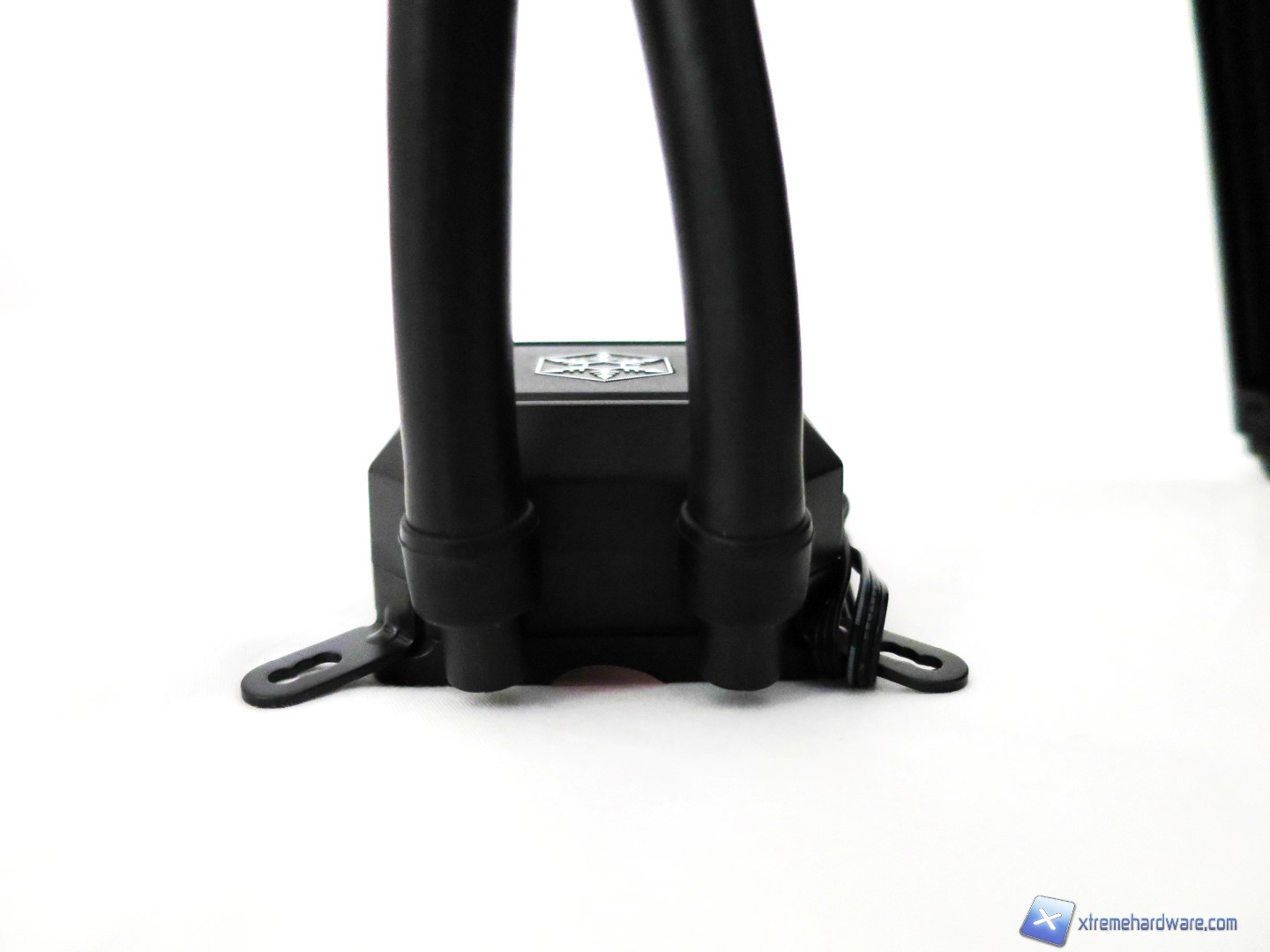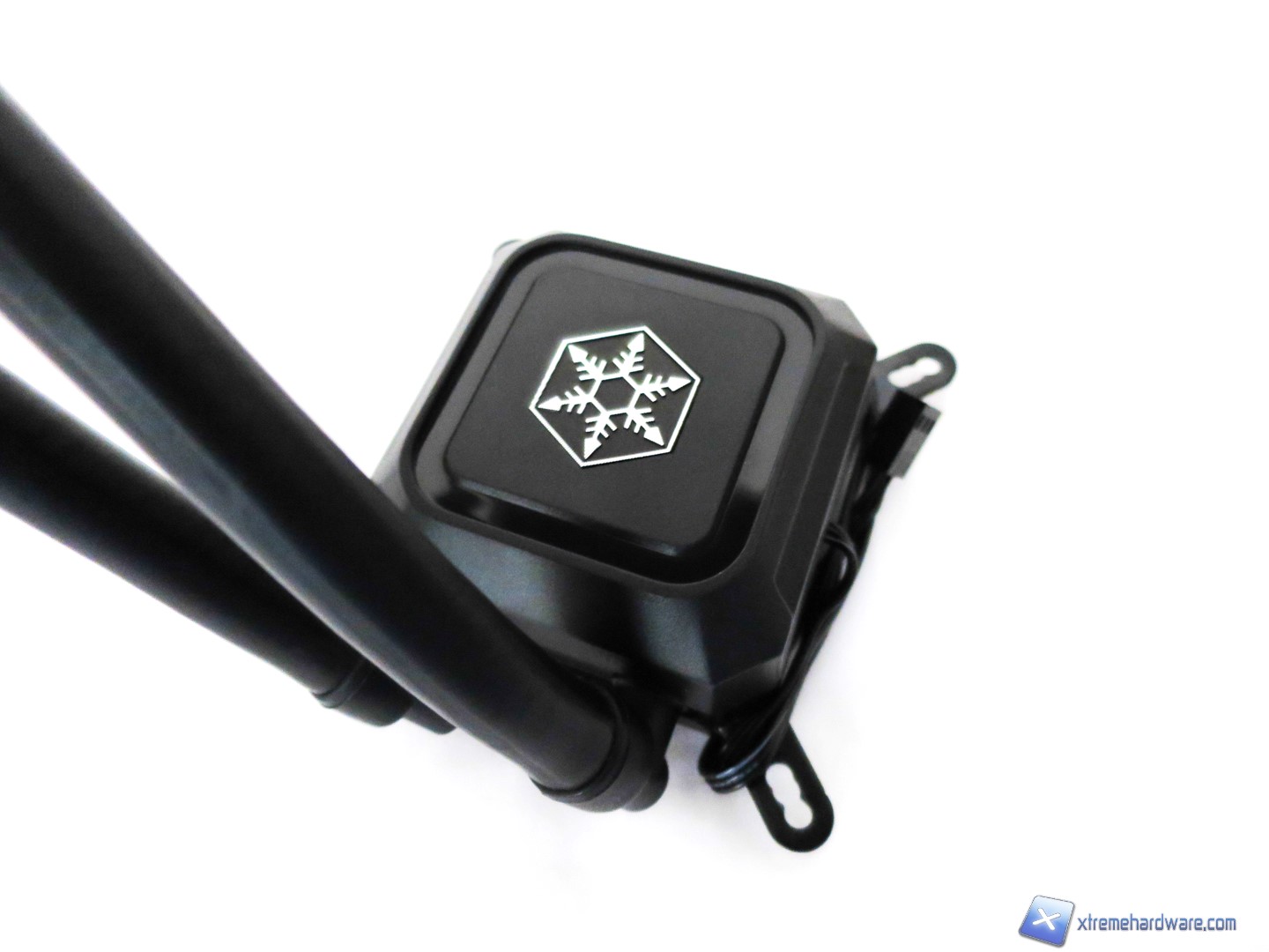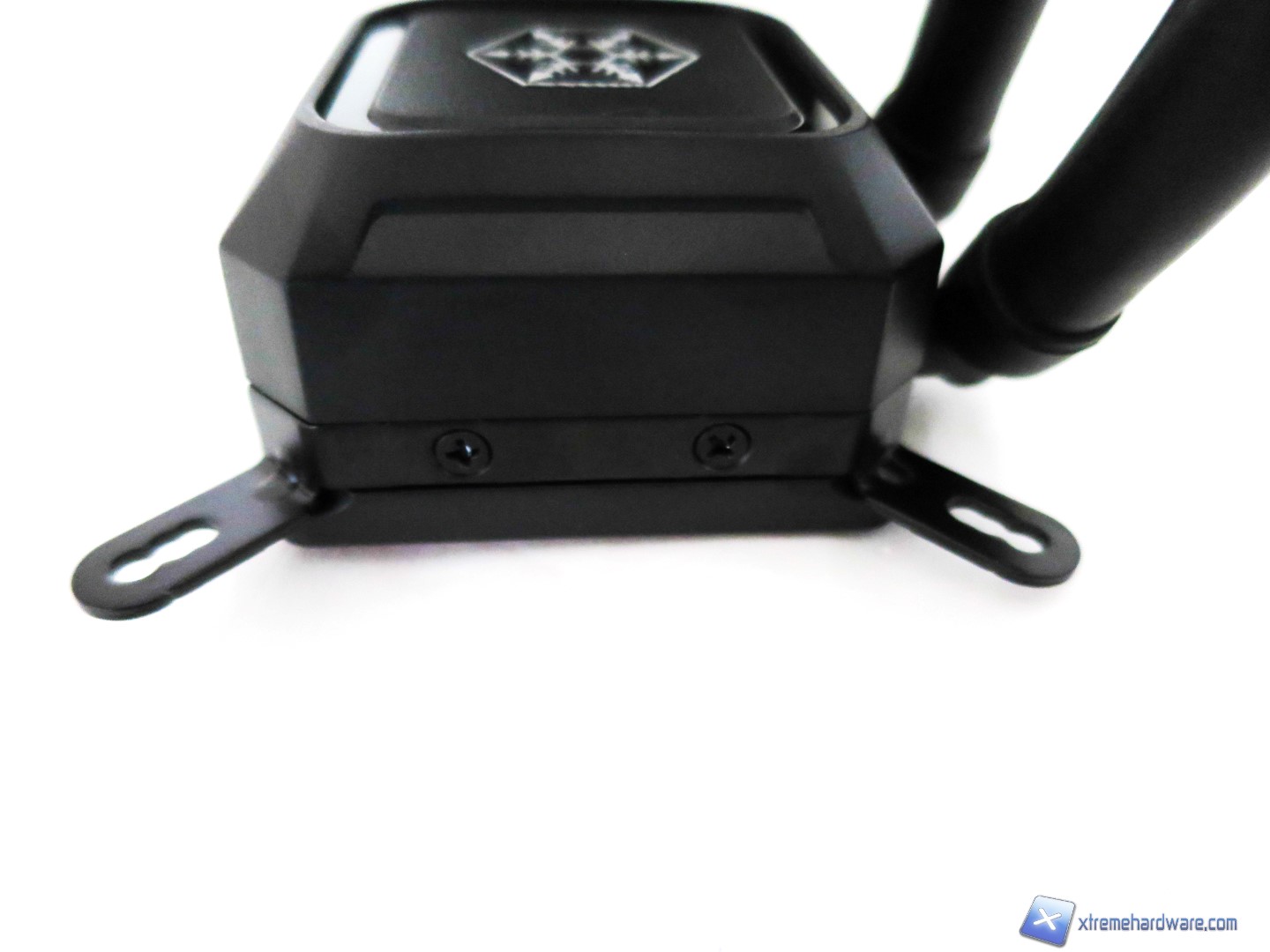 Giunti finalmente al blocco pompa/waterblock possiamo osservare il medesimo design a forma quadrata con bordi smussati e tondeggianti. Le dimensioni di tale blocco sono sempre di 65 x 65 x 38mm ed ospitano al solito una pompa a 12V con RPM massimi di 2500.  La strutta ovviamente è in plastica ma molto robusta e ben assemblata. Se i lati di tale blocco sono in plastica di colore nero opaco, troviamo quasi a circoscrivere il logo del brand, una plastica lucida sempre di colore nero. Al centro troviamo il logo di SilverStone di colore argento e all’interno un LED di colore blu. La struttura anche in questo caso è dotata dei supporti per Socket Intel già preinstallati e potranno essere cambiati con quelli del socket AMD semplicemente svitando due piccole viti filettate poste ai lati.