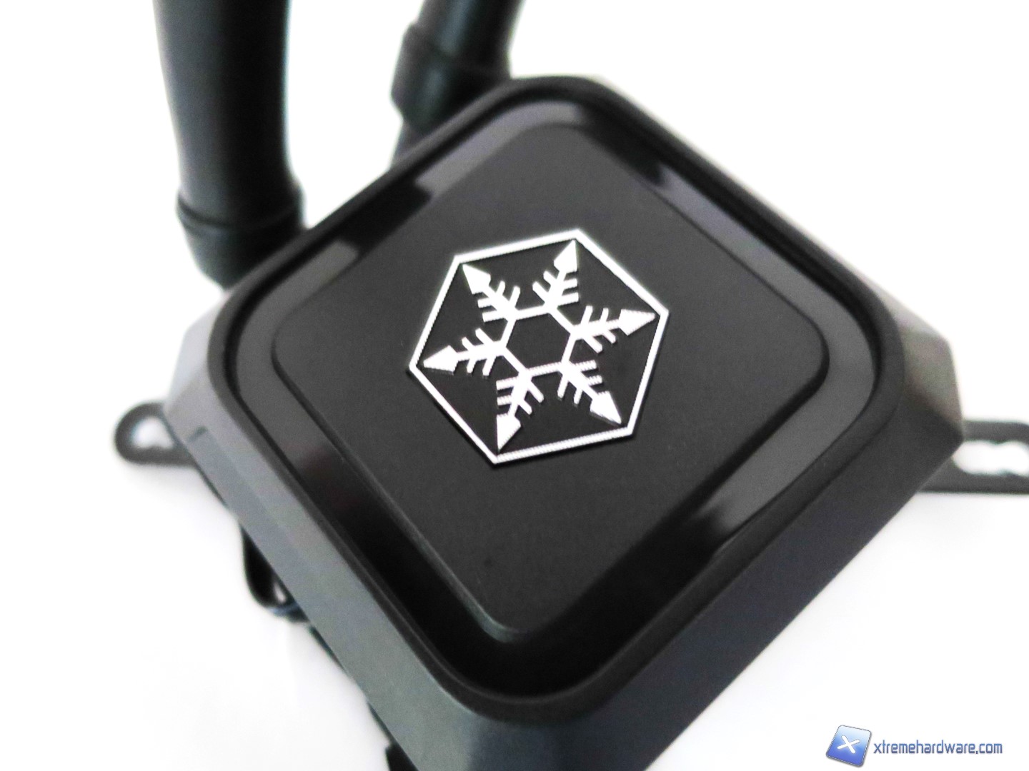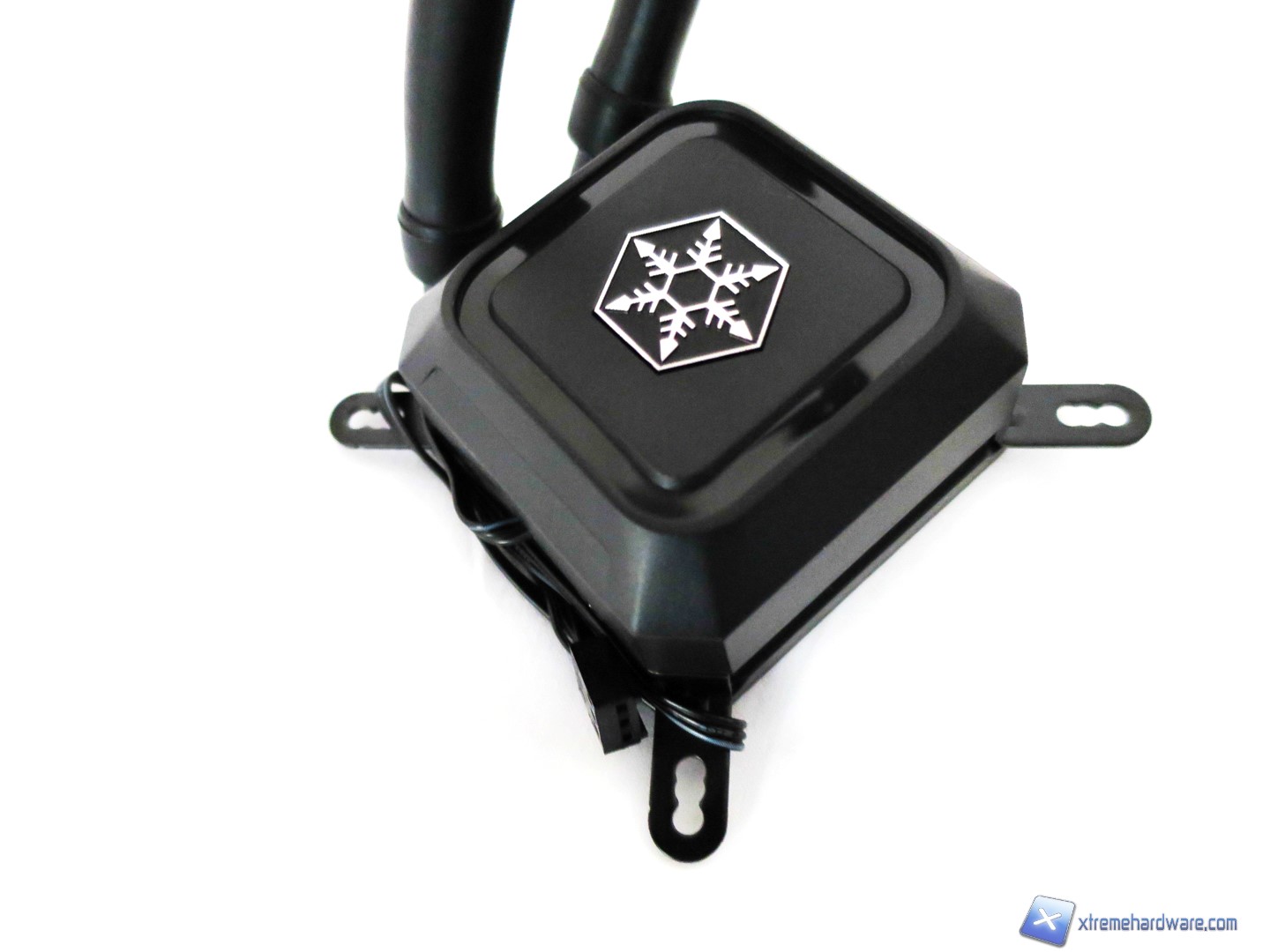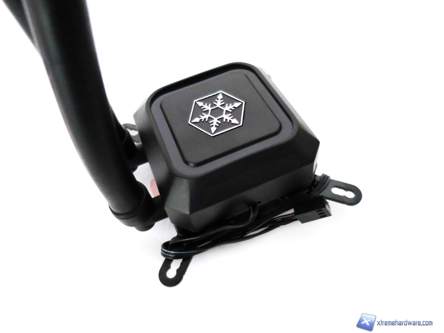 Giunti finalmente al blocco pompa/waterblock possiamo osservare il medesimo design a forma quadrata con bordi smussati e tondeggianti. Le dimensioni di tale blocco sono sempre di 65 x 65 x 38mm ed ospitano al solito una pompa a 12V con RPM massimi di 2500.  La strutta ovviamente è in plastica ma molto robusta e ben assemblata. Se i lati di tale blocco sono in plastica di colore nero opaco, troviamo quasi a circoscrivere il logo del brand, una plastica lucida sempre di colore nero. Al centro troviamo il logo di SilverStone di colore argento e all’interno un LED di colore blu. La struttura anche in questo caso è dotata dei supporti per Socket Intel già preinstallati e potranno essere cambiati con quelli del socket AMD semplicemente svitando due piccole viti filettate poste ai lati.