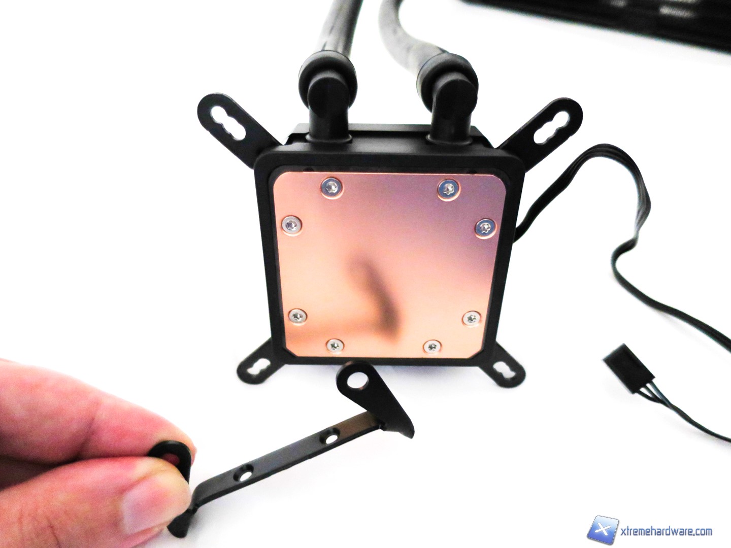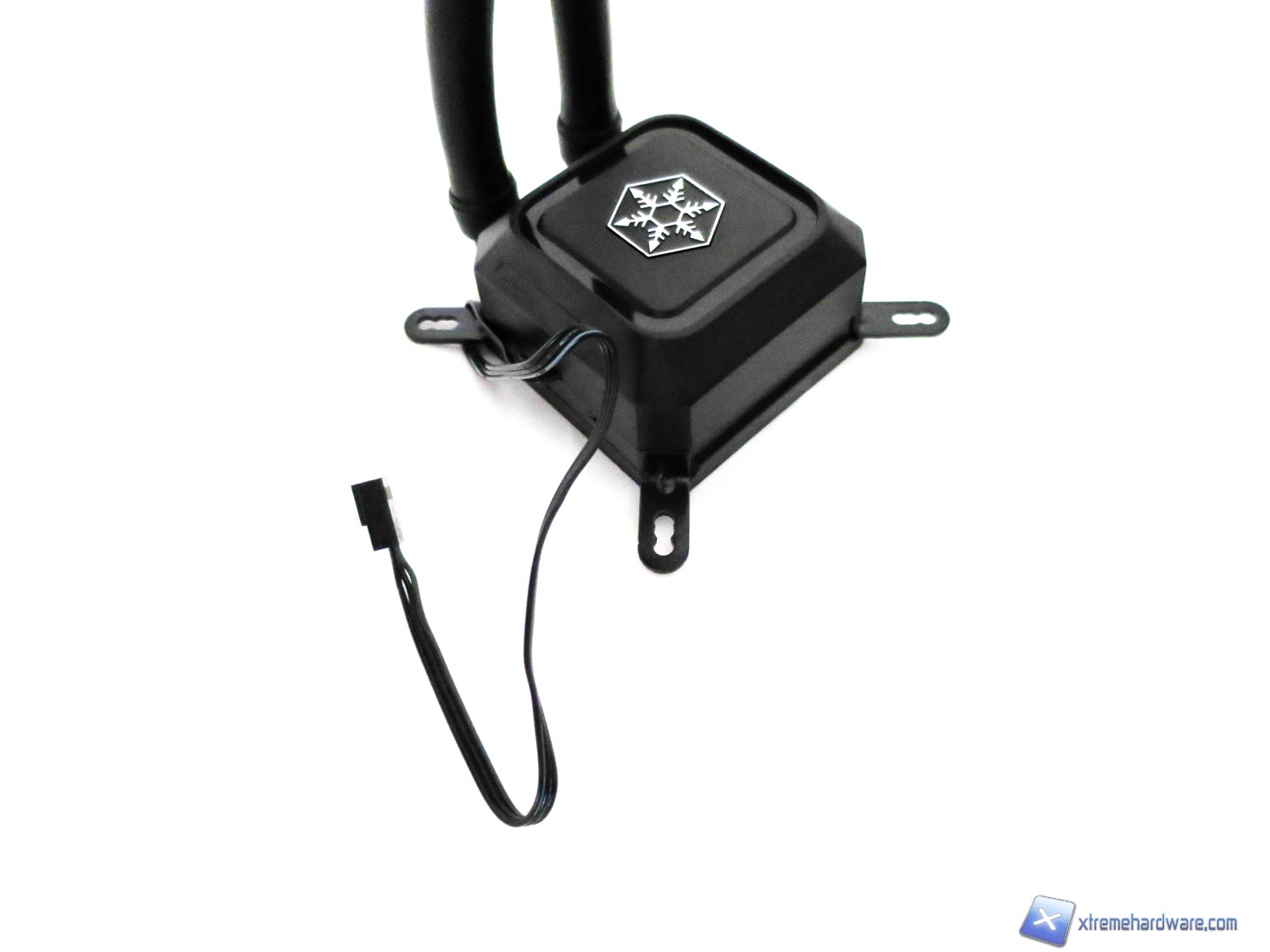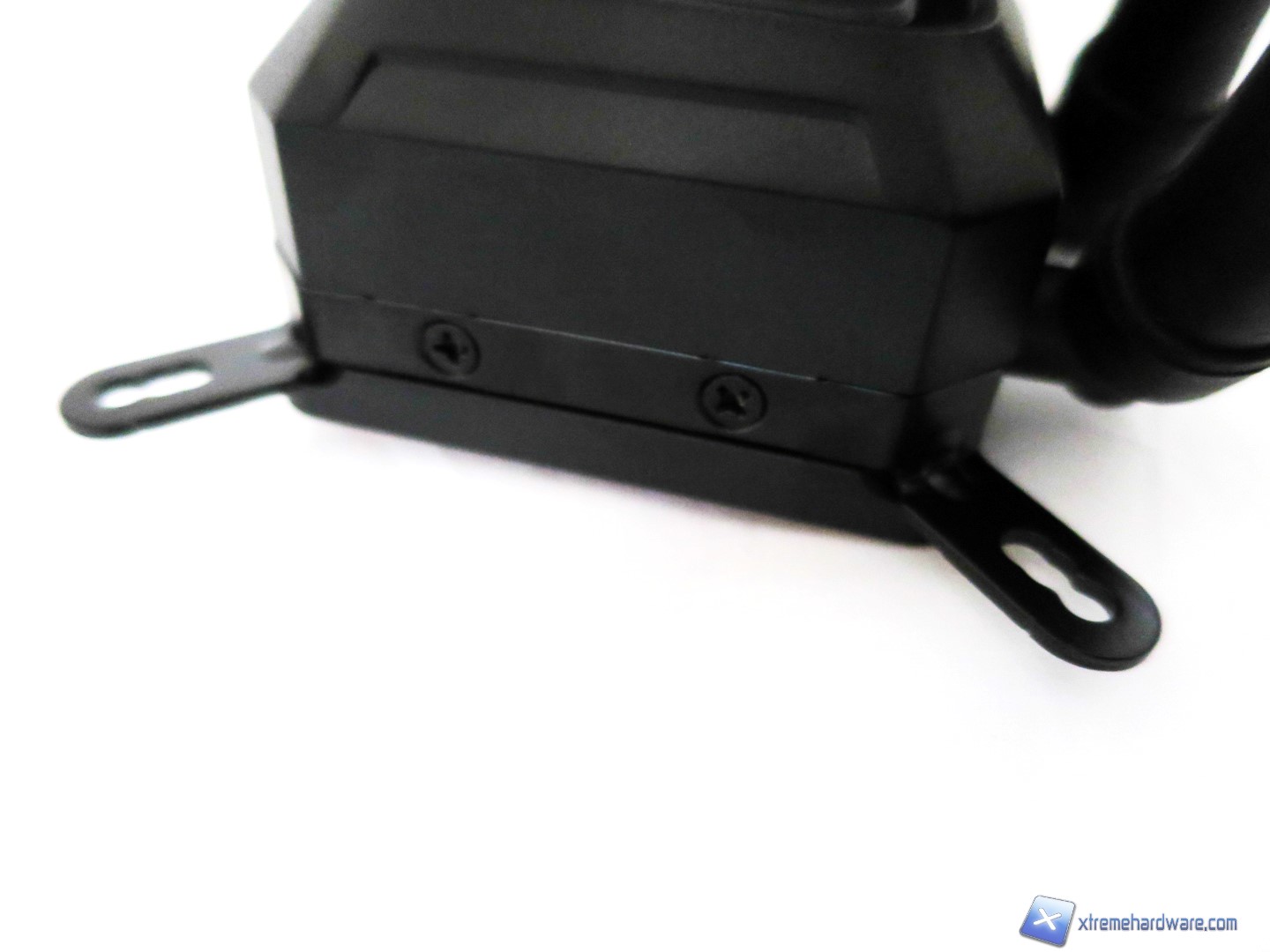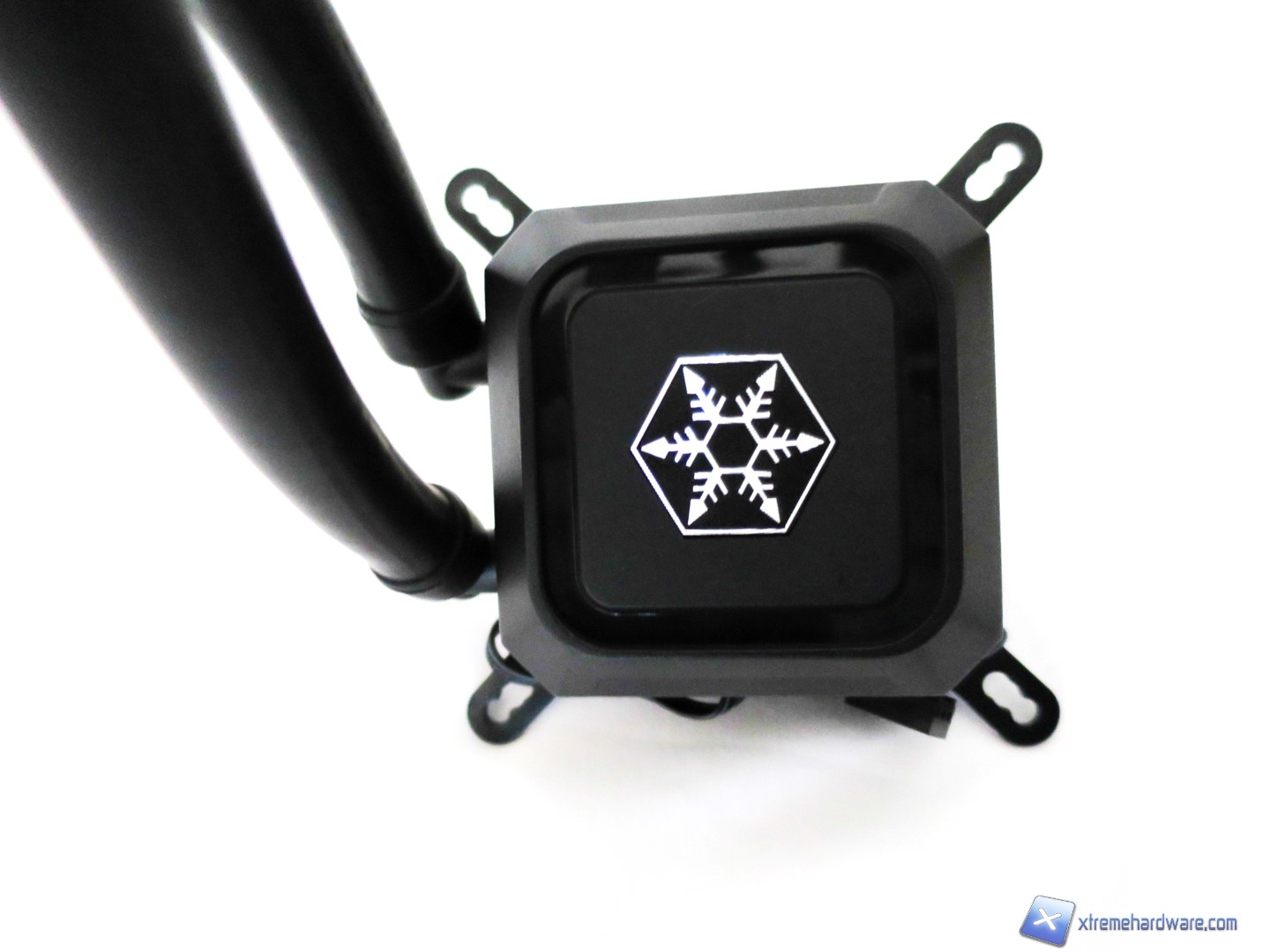 Giunti finalmente al blocco pompa/waterblock possiamo osservare il medesimo design a forma quadrata con bordi smussati e tondeggianti. Le dimensioni di tale blocco sono sempre di 65 x 65 x 38mm ed ospitano al solito una pompa a 12V con RPM massimi di 2500.  La strutta ovviamente è in plastica ma molto robusta e ben assemblata. Se i lati di tale blocco sono in plastica di colore nero opaco, troviamo quasi a circoscrivere il logo del brand, una plastica lucida sempre di colore nero. Al centro troviamo il logo di SilverStone di colore argento e all’interno un LED di colore blu. La struttura anche in questo caso è dotata dei supporti per Socket Intel già preinstallati e potranno essere cambiati con quelli del socket AMD semplicemente svitando due piccole viti filettate poste ai lati.