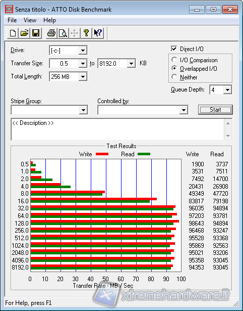 Atto è un benchmark gratuito che esegue dei semplici test in lettura e in scrittura in modalità sequenziale adoperando una Queue Depth (file in coda) di 4.